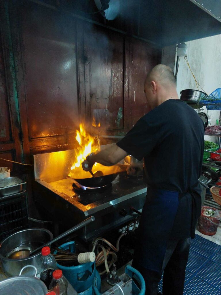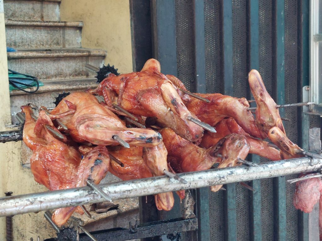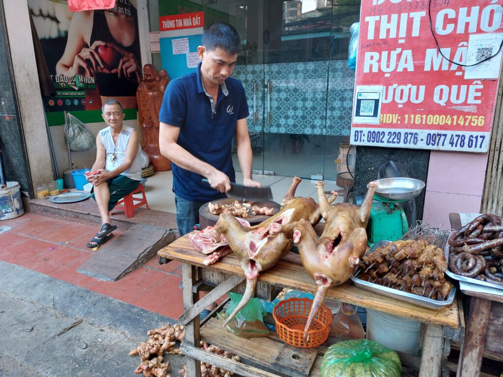 Er zijn veel kraampjes op straat waar je de heerlijkste dingen kunt kopen. En ja, ze eten hier ook hond (foto). We eten bij kleine straatrestaurantjes en bezoeken natuurlijk de oude wijk. We doen ‘s avonds een Foodtour. Hierbij hebben we een gids, samen met een stel uit Zwitserland. De gids geeft uitleg over het eten en we bezoeken kleine bijzondere eettentjes. We proberen de beroemde Egg koffie; met geklopt ei met suiker op de koffie. Dit komt voort uit de oorlogstijd toen ze niets te eten hadden en dus men alles wat maar enigszins eetbaar was ging eten. Melk was er niet meer en eieren wel. Dus maar geklopt ei boven op de koffie in plaats van melk. Ze eten veel in olie gebakken pakketjes. Zoet en hartig. Pho, de noedelsoep met vlees en groenten, (plak)rijst met vlees, vis en groenten. We wilden ook een kookworkshop doen, maar dat is er niet van gekomen.