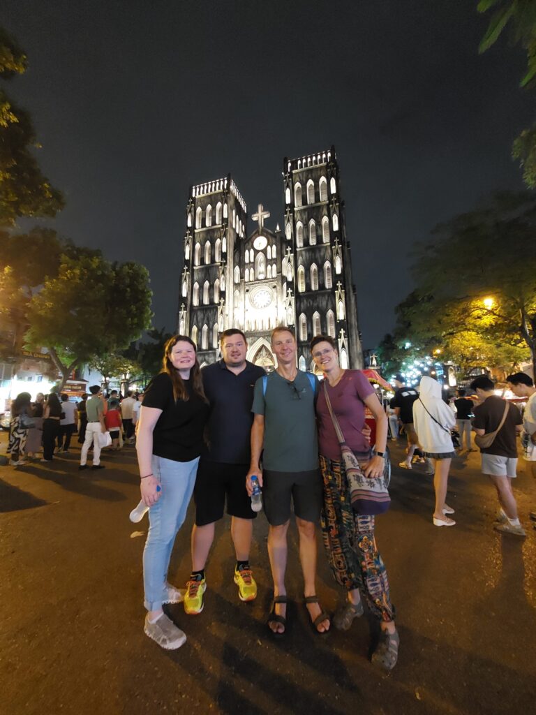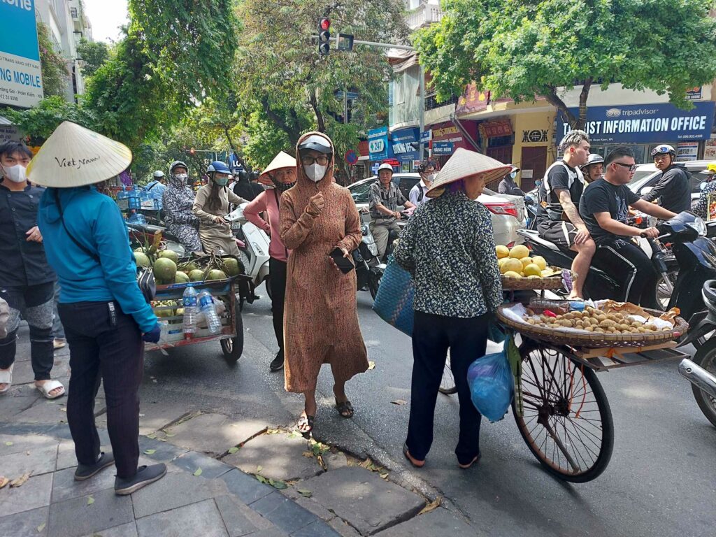Hanoi is en blijft een super drukke, chaotische maar heerlijke stad. We zijn er in 2007 al een keer geweest. Toen hebben we een fietstocht gemaakt van Ho Chi Minh naar deze hoofdstad. Je kunt hier ons verhaal uit 2007 lezen. Op straat rijden er meer brommers dan auto’s. Alles krioelt door elkaar heen. We weten dat we op zo’n drukke straat met oversteken gewoon mogen gaan lopen. Het verkeer krioelt zich dan om je heen. Iedereen toetert, hoe groter het voertuig hoe harder de claxon gaat. Tot wel 130 decibel! Er lijken weinig regels te zijn. Met of zonder helm, wel of geen voorrang. Iedereen kijkt of hij ergens naar toe kan en de ander geeft dan ruimte. Als er iemand van achter komt, toetert deze ten teken dat hij of zij er aan komt. Deelnemers aan het verkeer kijken dus ook niet achterom en ze gebruiken geen spiegels. Ze horen wel of er iemand aankomt die voorbij wil.