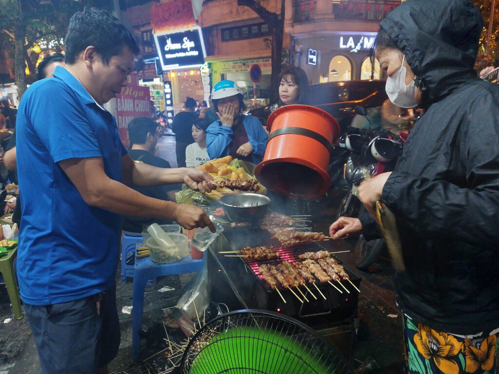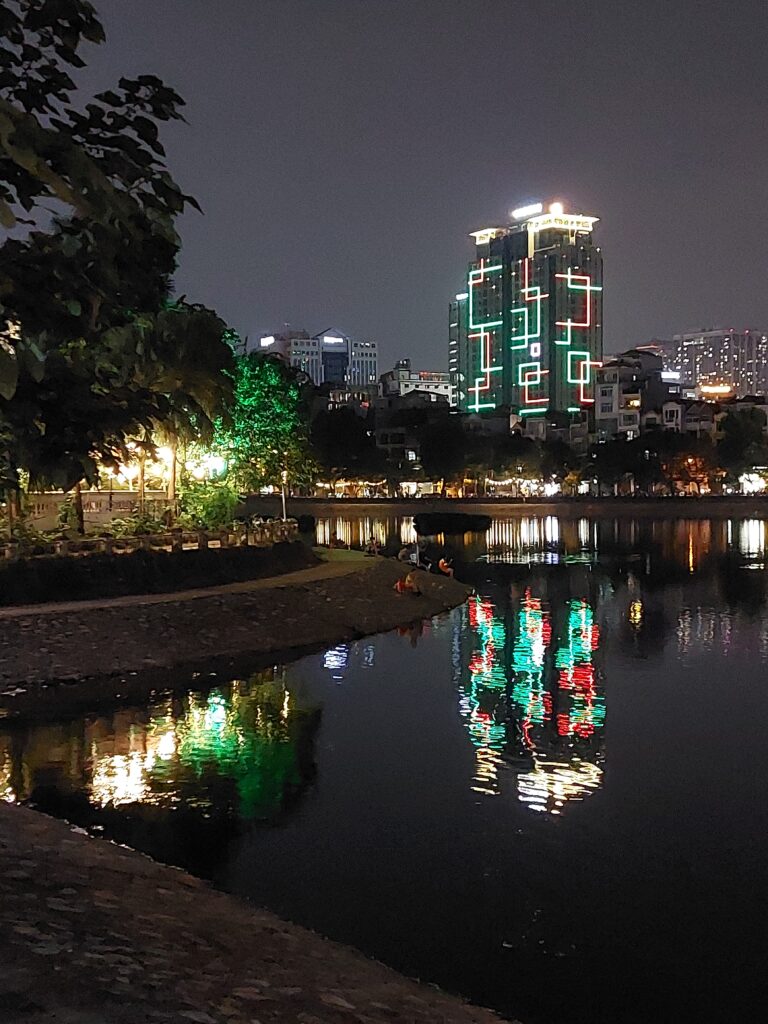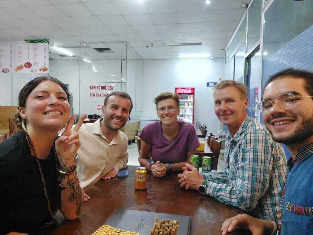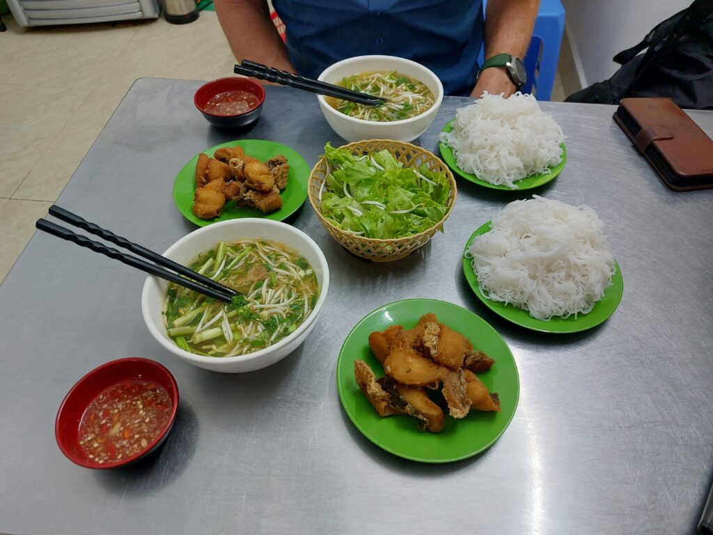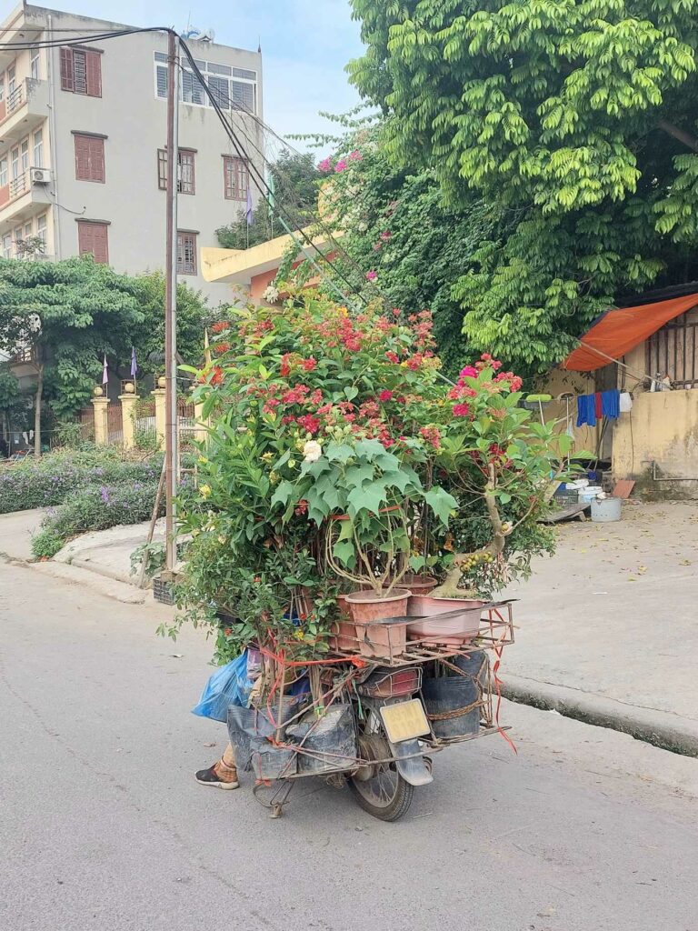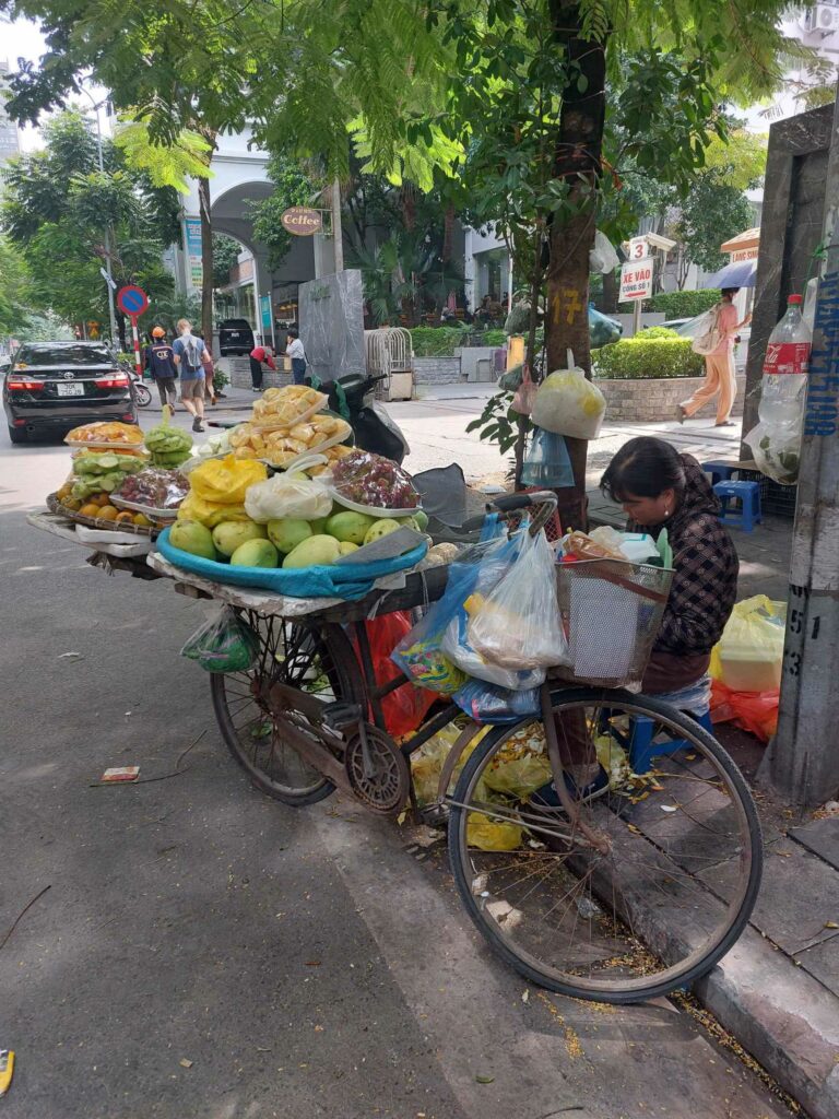 Via Booking.com hebben we een kamer gereserveerd in een hostel in een klein straatje. We komen rond middernacht aan. We kunnen onze fietsdozen beneden stallen. Omdat we een weekje willen blijven, hebben een ruime kamer geboekt met een bank, werktafel en uitzicht over de stad. In het echt is alles wat kleiner, de bank is er niet en het balkon is een halve meter breed en een meter verder is alweer het volgende gebouw. ’s Morgens lopen we de straat op om een ontbijtje bij elkaar te scharrelen. Altijd weer bekijken wat je in een ander land kunt eten voor ontbijt. Met yoghurt, havermout en fruit komen we al een heel eind. Daarna regelen we een simkaart bij Viettel omdat deze het beste bereik zou hebben. Geld pinnen. Ze gebruiken hier heel vaak een QR code om te betalen. Dit kan bij de kleinste kraampjes, maar dan moet je wel een Vietnamese bankrekening hebben.