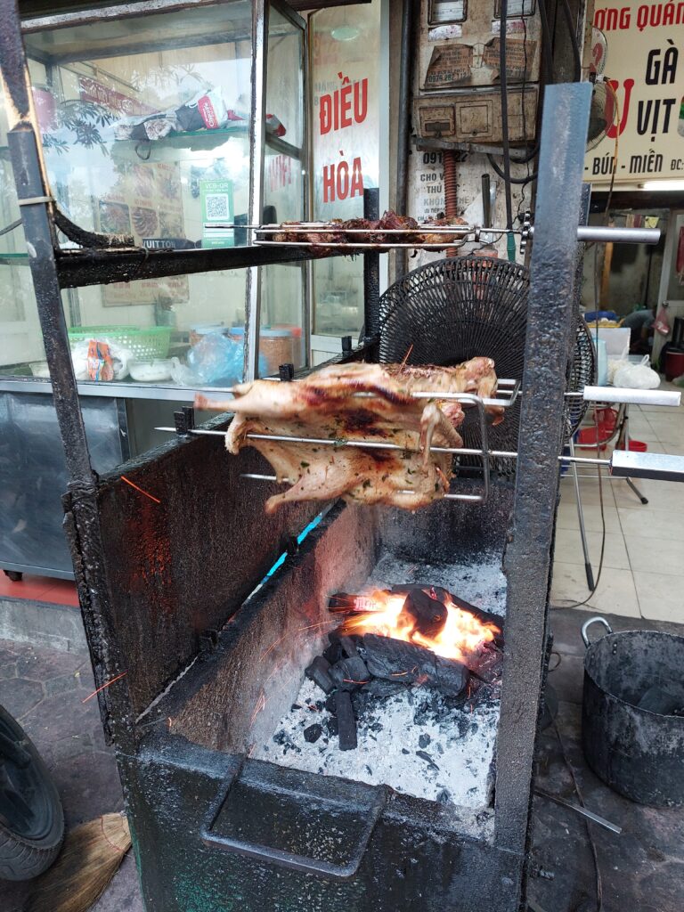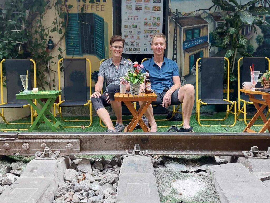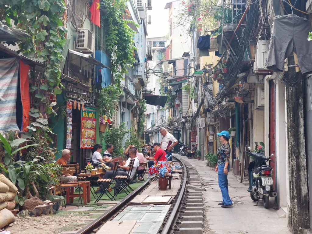 We reizen op en neer van ons hostel wat in een andere wijk ligt dan het oude centrum, met een soort Uber taxi; ”Grab” heet dat hier. Met een app op je mobiel, kun je gemakkelijk een taxi bestellen en ook meteen betalen met credit kaart. Erg veilig, gemakkelijk en goedkoop, zonder gedoe. In de kleine straatjes is van alles te koop. Hoe klein het straatje ook is overal in Hanoi rijden brommers en motoren. We doen ook een Free Walking tour. Altijd interessant om een stad te leren kennen. We vinden één van de weinige geocaches en natuurlijk drinken we koffie in de “treinstraat”. Een spoor in een smal straatje dwars door de stad. Op gezette tijden komt een trein langs. De stoeltjes en tafeltjes moeten een beetje aan de kant als de trein voorbij getoeterd komt. Indrukwekkend als de trein langs komt (video hieronder). De fietsen zetten we op onze kamer weer in elkaar. Door de verhalen over de Ha Giang loop (mega steile wegen maar het schijnt de mooiste weg van heel zuid oost Azië te zijn) gaan we niet meteen naar Sapa, maar besluiten we eerst deze Ha Giang loop te gaan doen. Op de brommer of op de fiets dat weten we nog niet, dat besluiten we daar wel.