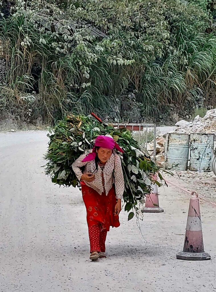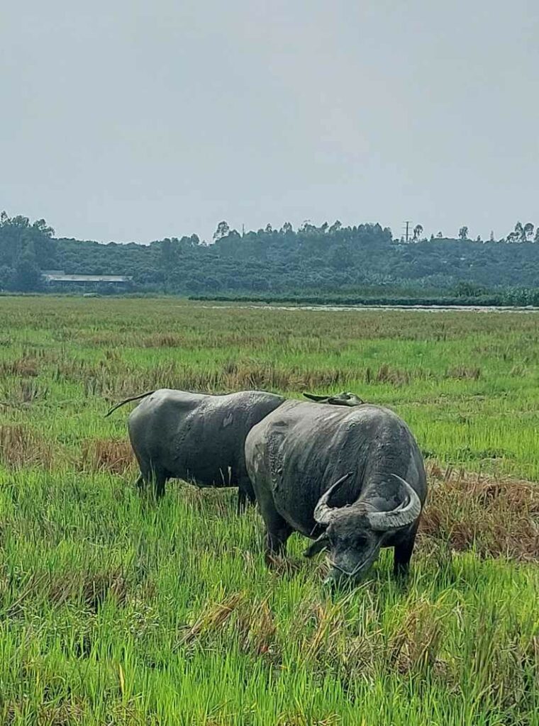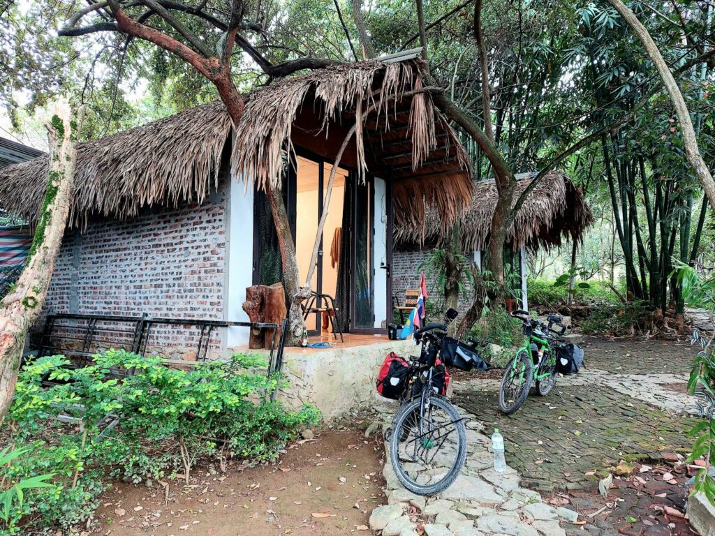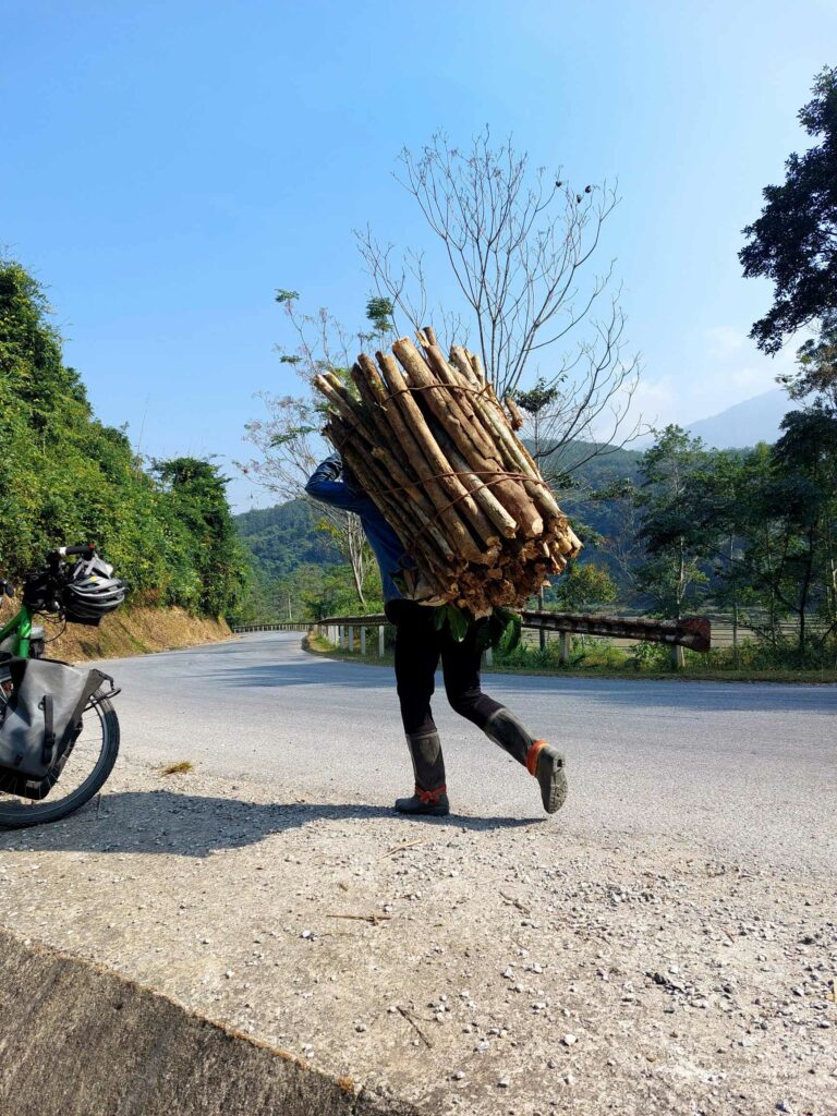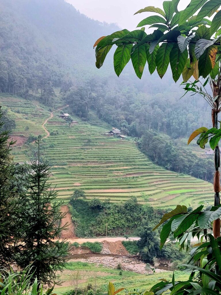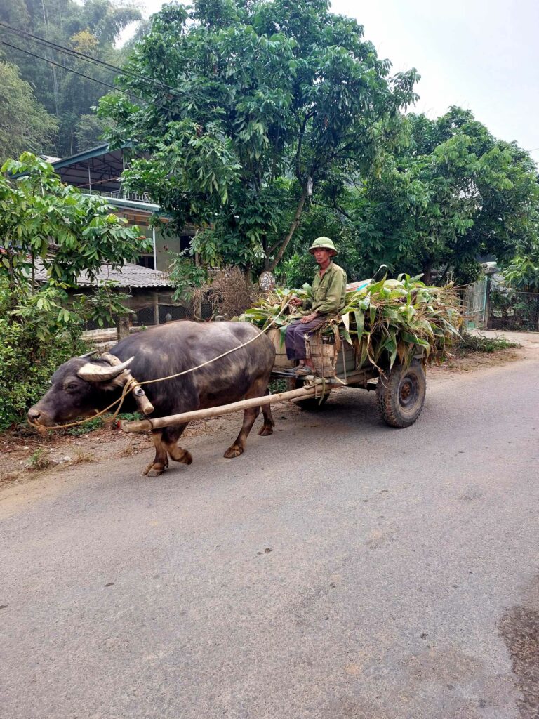 Na 8 dagen Hanoi stappen we, na in totaal na 2,5 week, weer op de fiets. We begeven ons in het drukke verkeer. Net als de vorige keer gaat dit eigenlijk heel gemakkelijk. Wat opvalt is dat er vergeleken met 16 jaar geleden veel minder fietsers op de weg zijn. Iedereen zit op een brommer en hier en daar een auto of vrachtwagen. Ook hier blijft iedereen die van achter komt toeteren. We schrikken ons zelf soms een ongeluk, zo hard. We gaan richting Ha Giang in het noorden. De routeapp Komoot heeft een mooie route voor ons gemaakt waarbij we al snel over kleine paadjes tussen de rijstvelden fietsen. Het nationale dier, de waterbuffel, zien we overal in de modder van die velden, nu de rijst is geoogst. Ook veel vers fruit zoals papaja, pomelo en dragonfruit. Natuurlijk zit er ook weer een pad in waar we de fietsen omhoog moeten duwen. Gelukkig hebben we nu minder bagage, dus dat is iets gemakkelijker. We zien veel plekken waar fineerhout wordt gedroogd. Later bedenken we dat het waarschijnlijk geen fineer is maar hout wat wordt verwerkt tot multiplex platen. We hebben geen tent meer, dat is geen enkel probleem. Er zijn meer dan voldoende hostels, hotels of Homestays. Of zoals ze hier ze meestal noemen: Nha Nghi. Als we in een Bamboe resort zijn en het op een ochtend regent, besluiten we een dag te blijven om een film te editen. In de middag lopen we naar de nabij gelegen waterval.