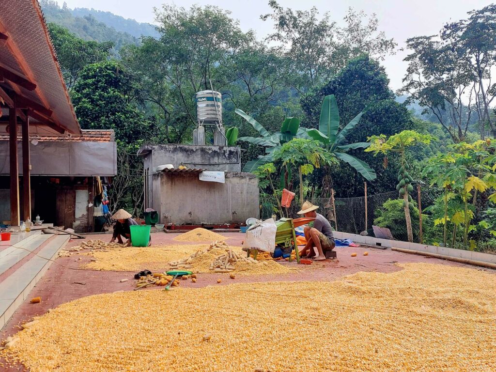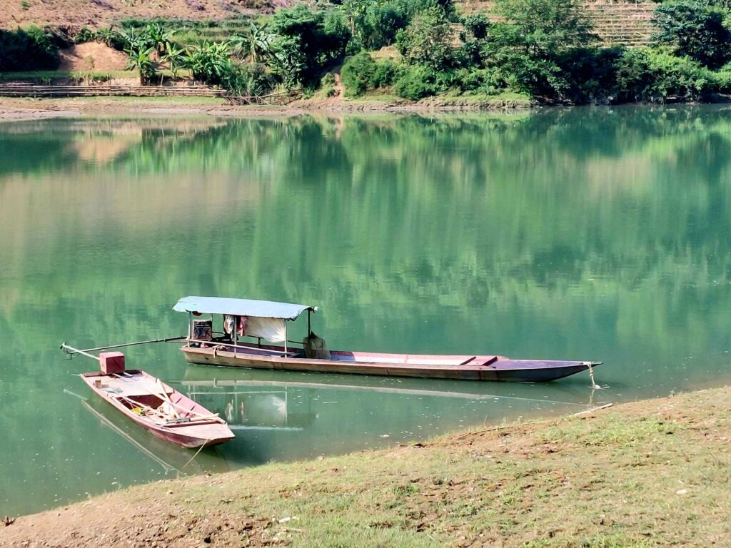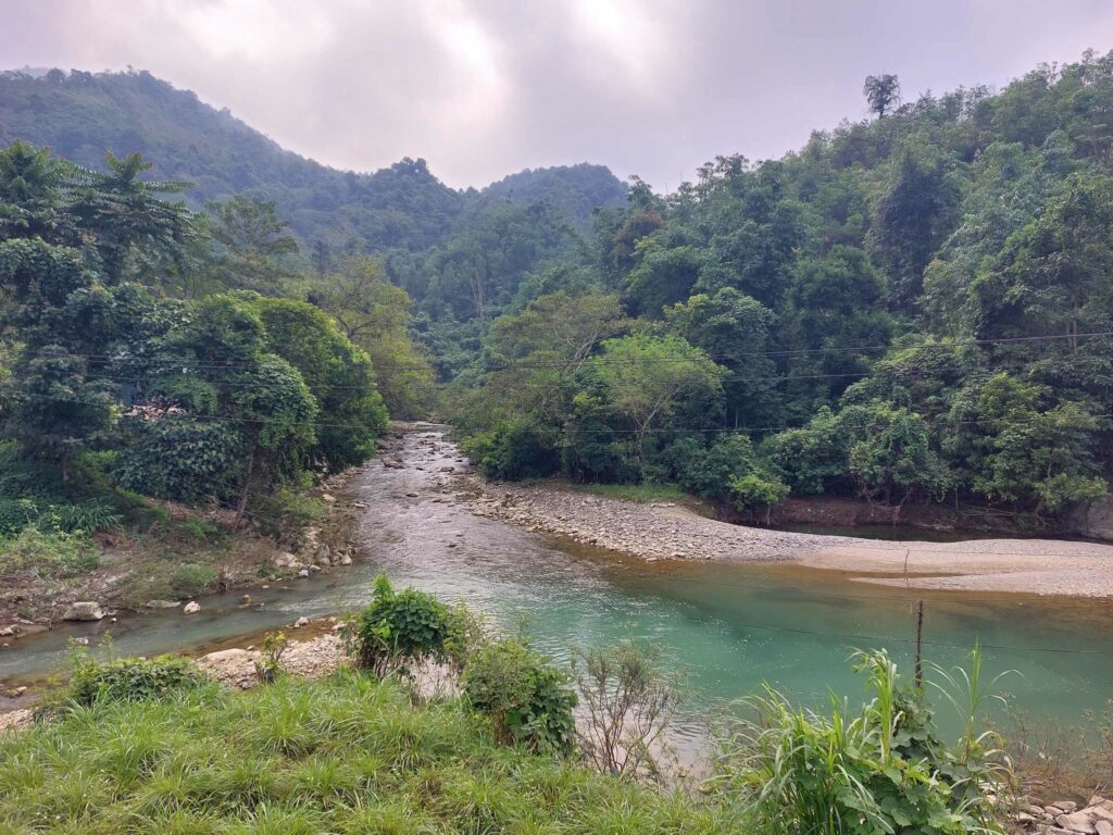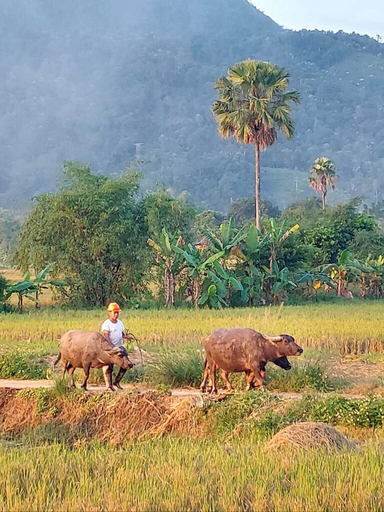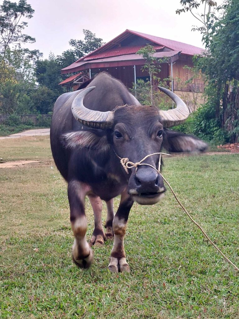 Na 8 dagen Hanoi stappen we, na in totaal na 2,5 week, weer op de fiets. We begeven ons in het drukke verkeer. Net als de vorige keer gaat dit eigenlijk heel gemakkelijk. Wat opvalt is dat er vergeleken met 16 jaar geleden veel minder fietsers op de weg zijn. Iedereen zit op een brommer en hier en daar een auto of vrachtwagen. Ook hier blijft iedereen die van achter komt toeteren. We schrikken ons zelf soms een ongeluk, zo hard. We gaan richting Ha Giang in het noorden. De routeapp Komoot heeft een mooie route voor ons gemaakt waarbij we al snel over kleine paadjes tussen de rijstvelden fietsen. Het nationale dier, de waterbuffel, zien we overal in de modder van die velden, nu de rijst is geoogst. Ook veel vers fruit zoals papaja, pomelo en dragonfruit. Natuurlijk zit er ook weer een pad in waar we de fietsen omhoog moeten duwen. Gelukkig hebben we nu minder bagage, dus dat is iets gemakkelijker. We zien veel plekken waar fineerhout wordt gedroogd. Later bedenken we dat het waarschijnlijk geen fineer is maar hout wat wordt verwerkt tot multiplex platen. We hebben geen tent meer, dat is geen enkel probleem. Er zijn meer dan voldoende hostels, hotels of Homestays. Of zoals ze hier ze meestal noemen: Nha Nghi. Als we in een Bamboe resort zijn en het op een ochtend regent, besluiten we een dag te blijven om een film te editen. In de middag lopen we naar de nabij gelegen waterval.