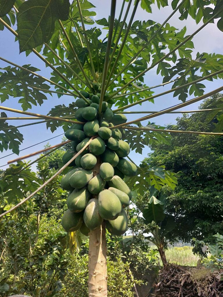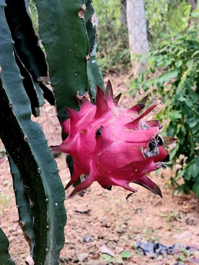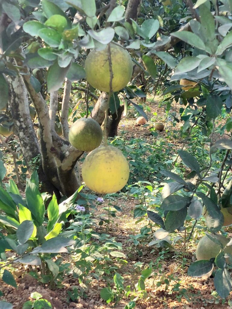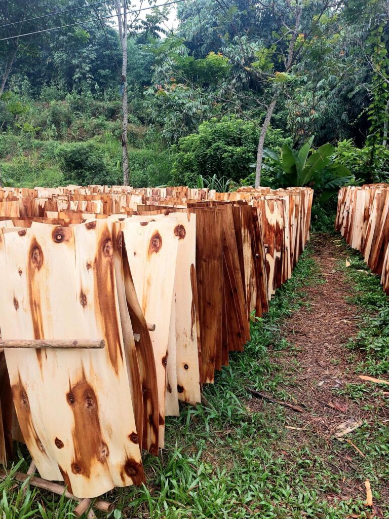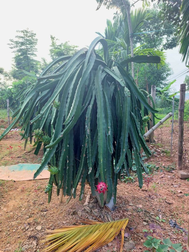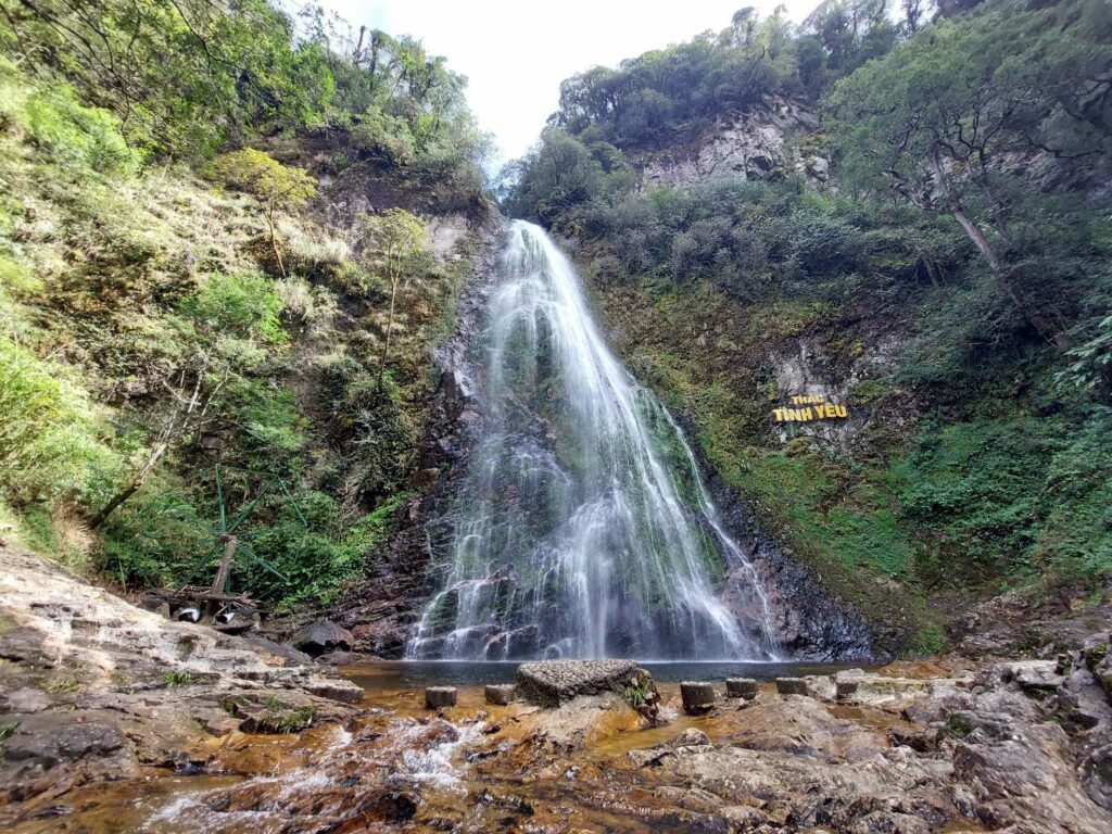 Na 8 dagen Hanoi stappen we, na in totaal na 2,5 week, weer op de fiets. We begeven ons in het drukke verkeer. Net als de vorige keer gaat dit eigenlijk heel gemakkelijk. Wat opvalt is dat er vergeleken met 16 jaar geleden veel minder fietsers op de weg zijn. Iedereen zit op een brommer en hier en daar een auto of vrachtwagen. Ook hier blijft iedereen die van achter komt toeteren. We schrikken ons zelf soms een ongeluk, zo hard. We gaan richting Ha Giang in het noorden. De routeapp Komoot heeft een mooie route voor ons gemaakt waarbij we al snel over kleine paadjes tussen de rijstvelden fietsen. Het nationale dier, de waterbuffel, zien we overal in de modder van die velden, nu de rijst is geoogst. Ook veel vers fruit zoals papaja, pomelo en dragonfruit. Natuurlijk zit er ook weer een pad in waar we de fietsen omhoog moeten duwen. Gelukkig hebben we nu minder bagage, dus dat is iets gemakkelijker. We zien veel plekken waar fineerhout wordt gedroogd. Later bedenken we dat het waarschijnlijk geen fineer is maar hout wat wordt verwerkt tot multiplex platen. We hebben geen tent meer, dat is geen enkel probleem. Er zijn meer dan voldoende hostels, hotels of Homestays. Of zoals ze hier ze meestal noemen: Nha Nghi. Als we in een Bamboe resort zijn en het op een ochtend regent, besluiten we een dag te blijven om een film te editen. In de middag lopen we naar de nabij gelegen waterval.