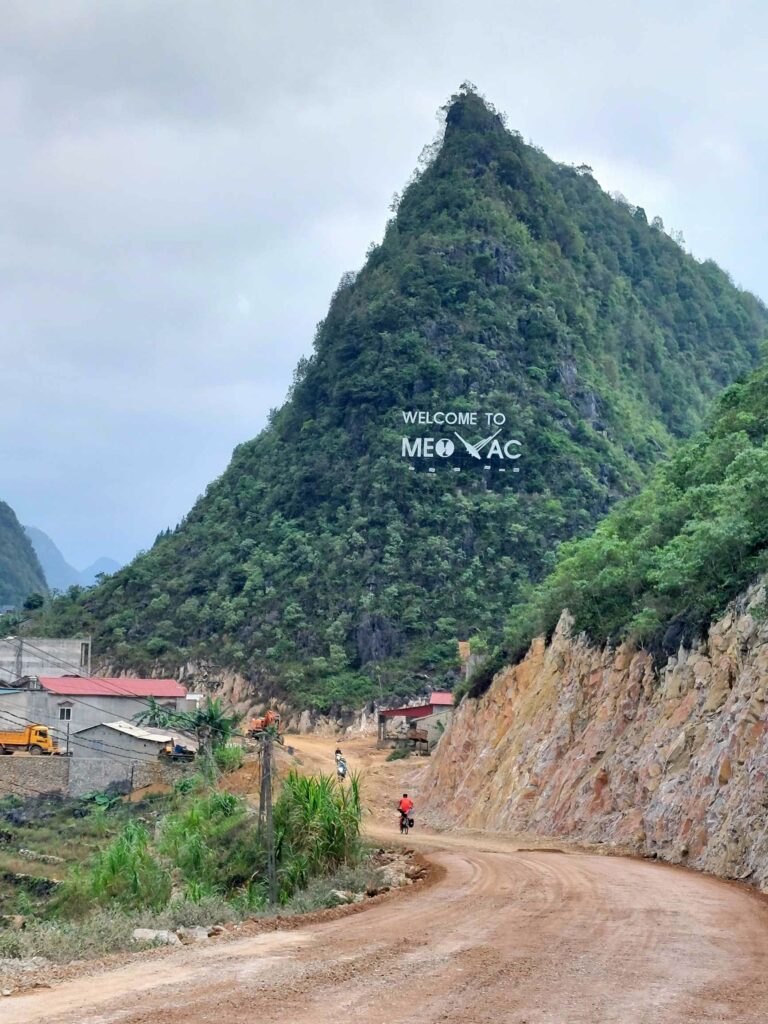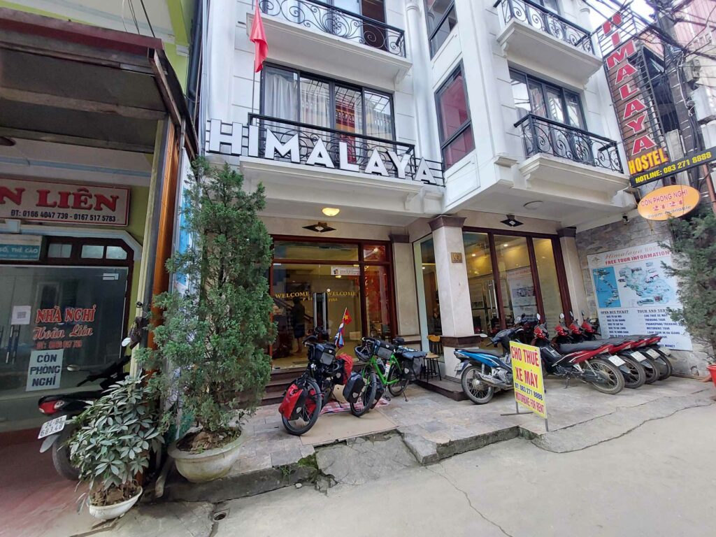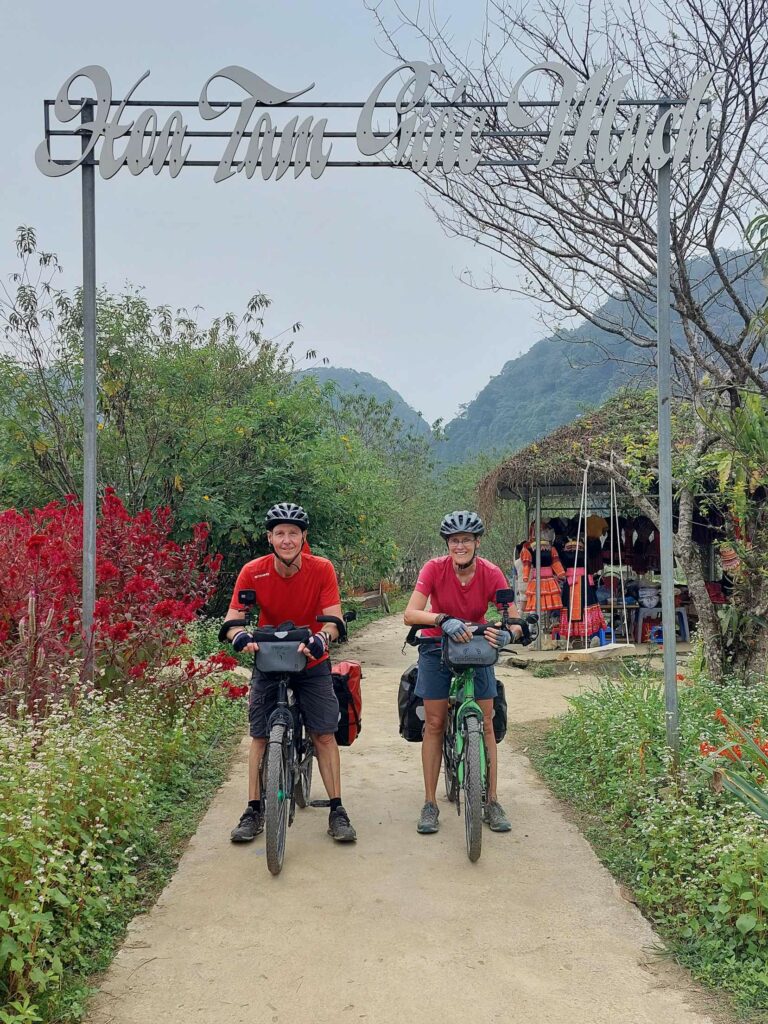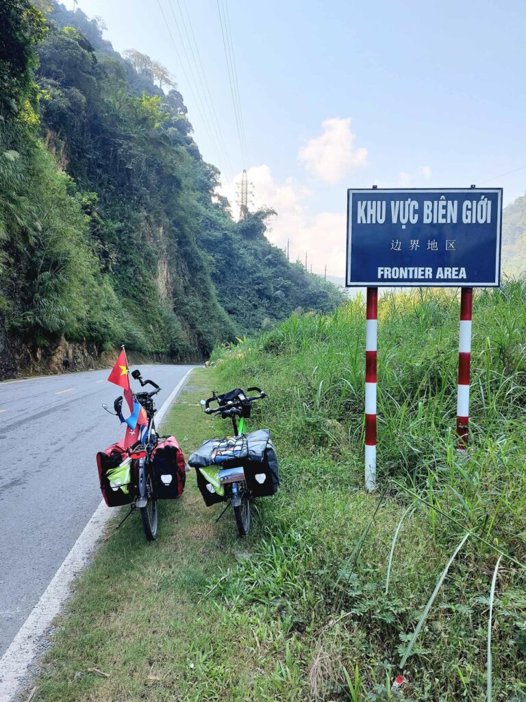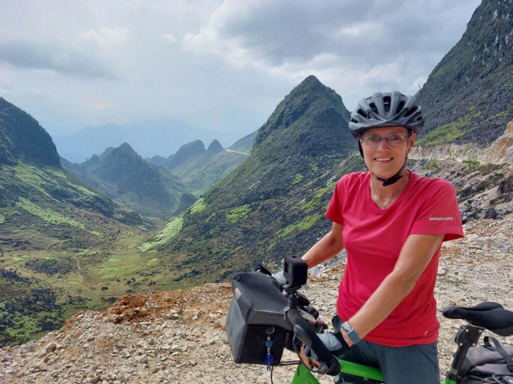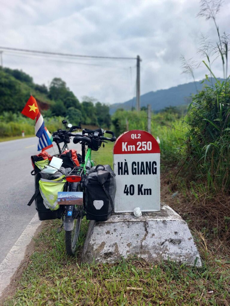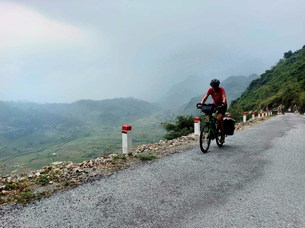 Wij fietsen de route tegen de klok in wat een goede keuze blijkt. De meeste brommers rijden met de klok mee dus die komen ons tegemoet, ze hoeven ons niet in te halen. Via Mau Due, waar we overnachten, komen we in Meo Vac. Vandaag een regendag in Meo Vac. Tijd om onze socials, en website bij te werken. Een dag later passeren we het hoogste punt van de loop, de Ma Pi Leng pass. Door de laag hangende wolken en mist zien we niet veel van de omgeving. Jammer want hier zouden mooie uitzichten zijn. Soms zien we tussen de wolken wat van de onderliggende Nho Que rivier en de bergen die aan de andere kant van het water liggen. Het geeft een mysterieus beeld. De omgeving blijft prachtig. Soms is er wel drukte met de brommers. De hellingen zijn lang en steil maar tot nu toe goed te doen. In de Ha Giang loop klimmen we elke dag tussen de 1100 en 1450 hoogtemeters. We fietsen tussen 35 en 65 km per dag. Na Sa Phin en Cho Kem komen we na zeven fietsdagen weer terug bij ons hostel in Ha Giang.