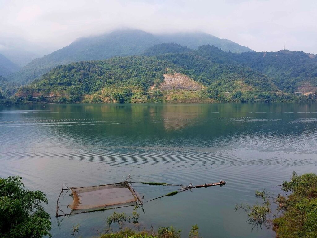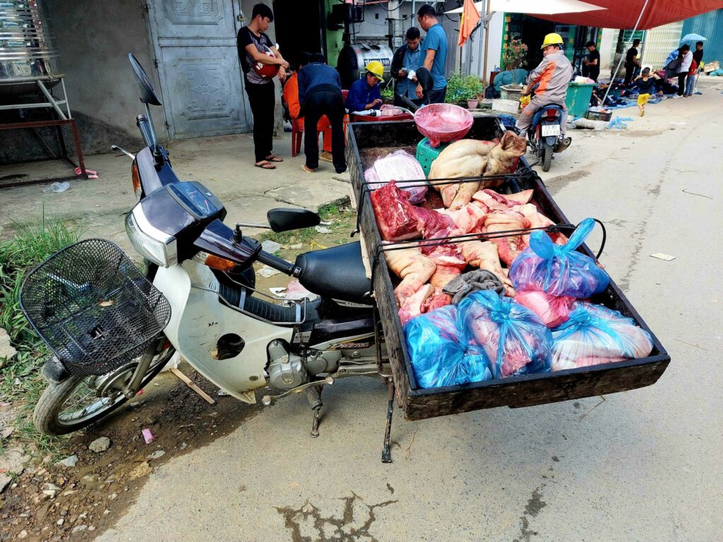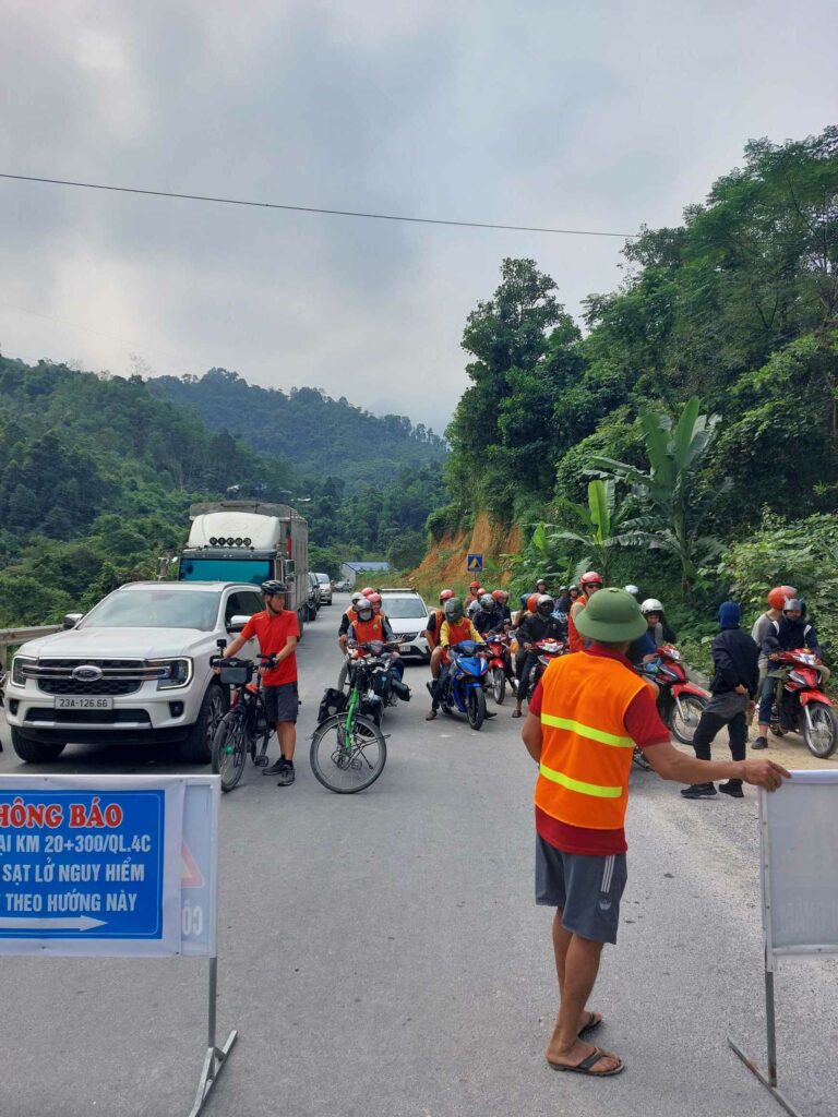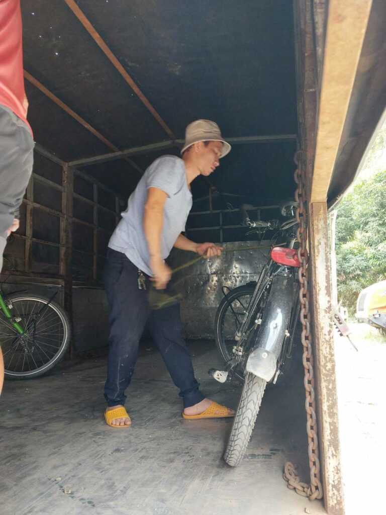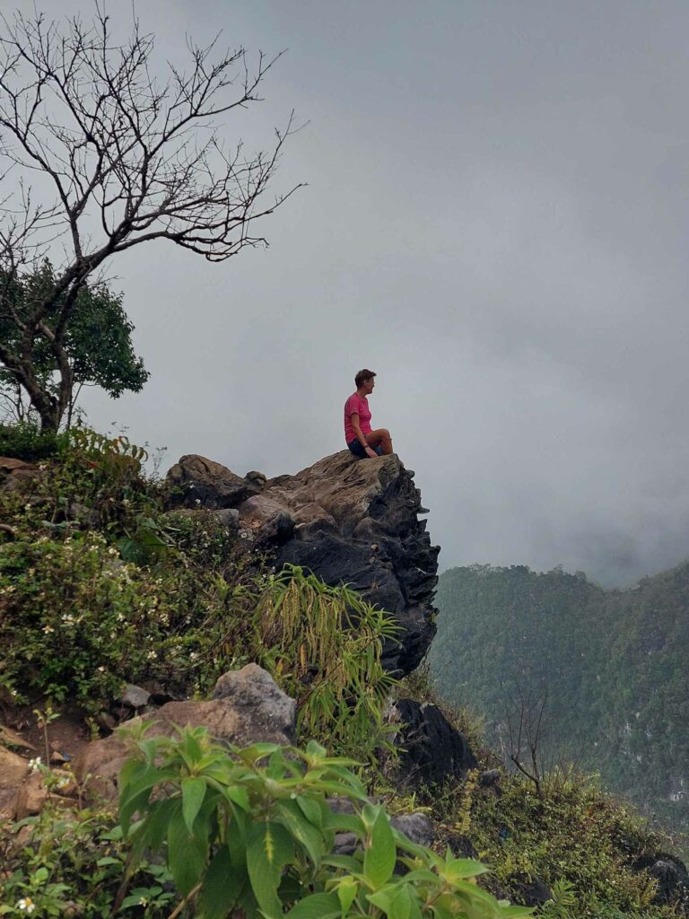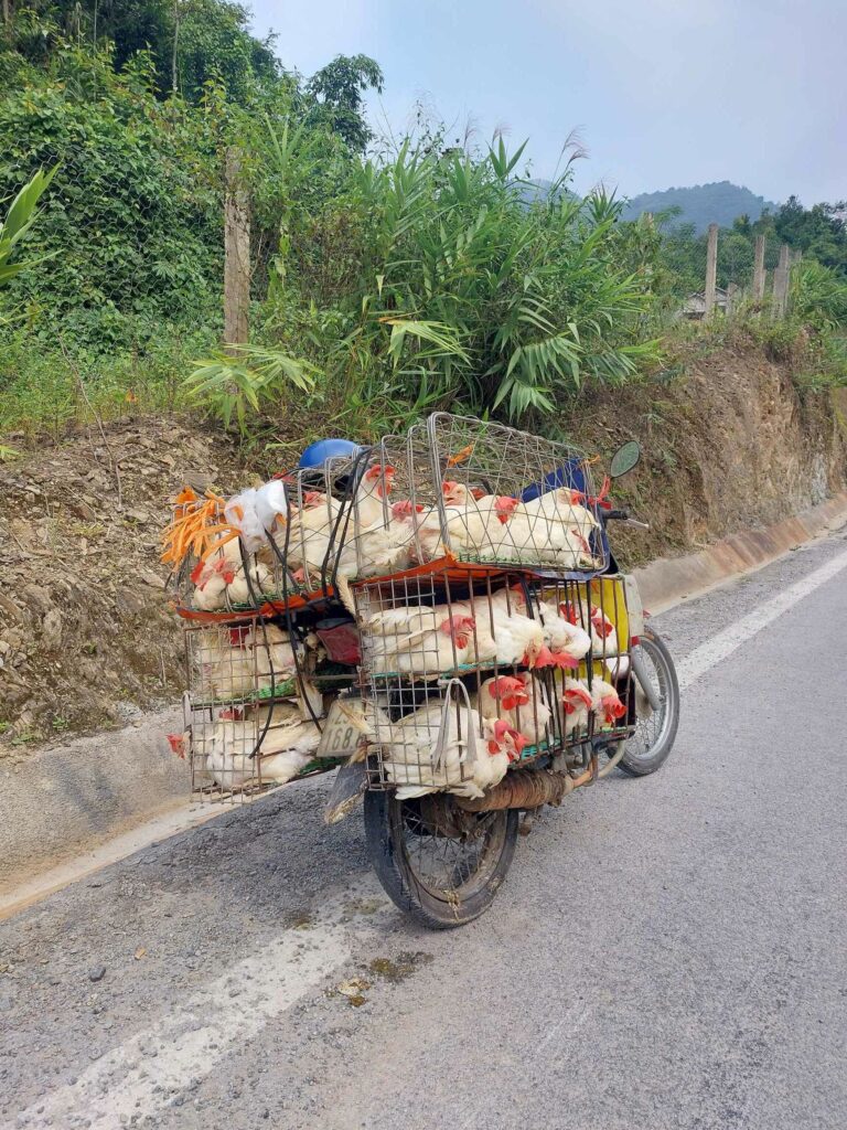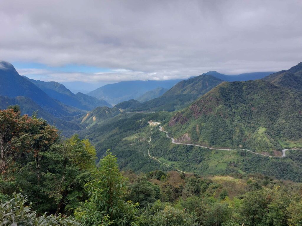 Wij fietsen de route tegen de klok in wat een goede keuze blijkt. De meeste brommers rijden met de klok mee dus die komen ons tegemoet, ze hoeven ons niet in te halen. Via Mau Due, waar we overnachten, komen we in Meo Vac. Vandaag een regendag in Meo Vac. Tijd om onze socials, en website bij te werken. Een dag later passeren we het hoogste punt van de loop, de Ma Pi Leng pass. Door de laag hangende wolken en mist zien we niet veel van de omgeving. Jammer want hier zouden mooie uitzichten zijn. Soms zien we tussen de wolken wat van de onderliggende Nho Que rivier en de bergen die aan de andere kant van het water liggen. Het geeft een mysterieus beeld. De omgeving blijft prachtig. Soms is er wel drukte met de brommers. De hellingen zijn lang en steil maar tot nu toe goed te doen. In de Ha Giang loop klimmen we elke dag tussen de 1100 en 1450 hoogtemeters. We fietsen tussen 35 en 65 km per dag. Na Sa Phin en Cho Kem komen we na zeven fietsdagen weer terug bij ons hostel in Ha Giang.