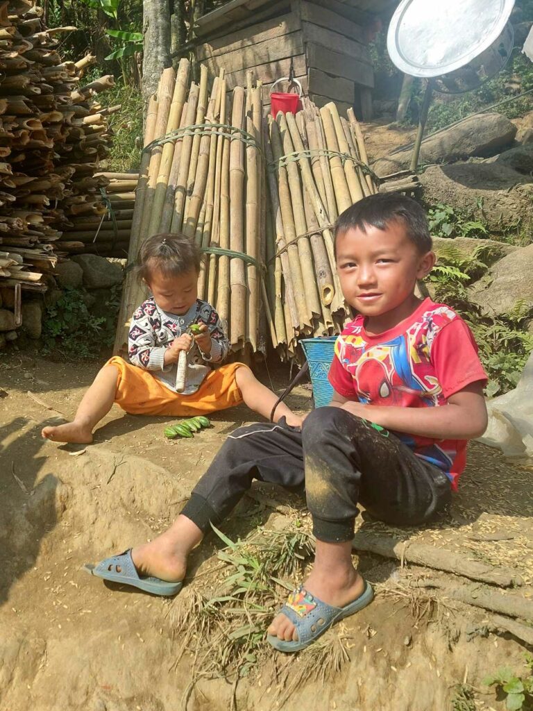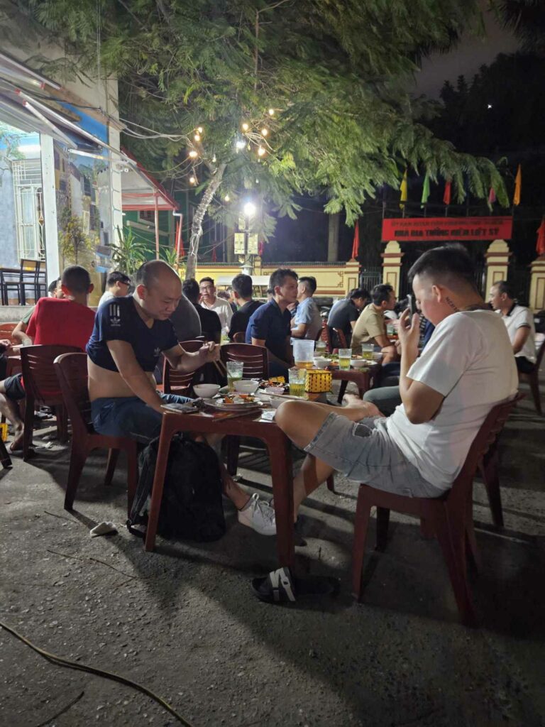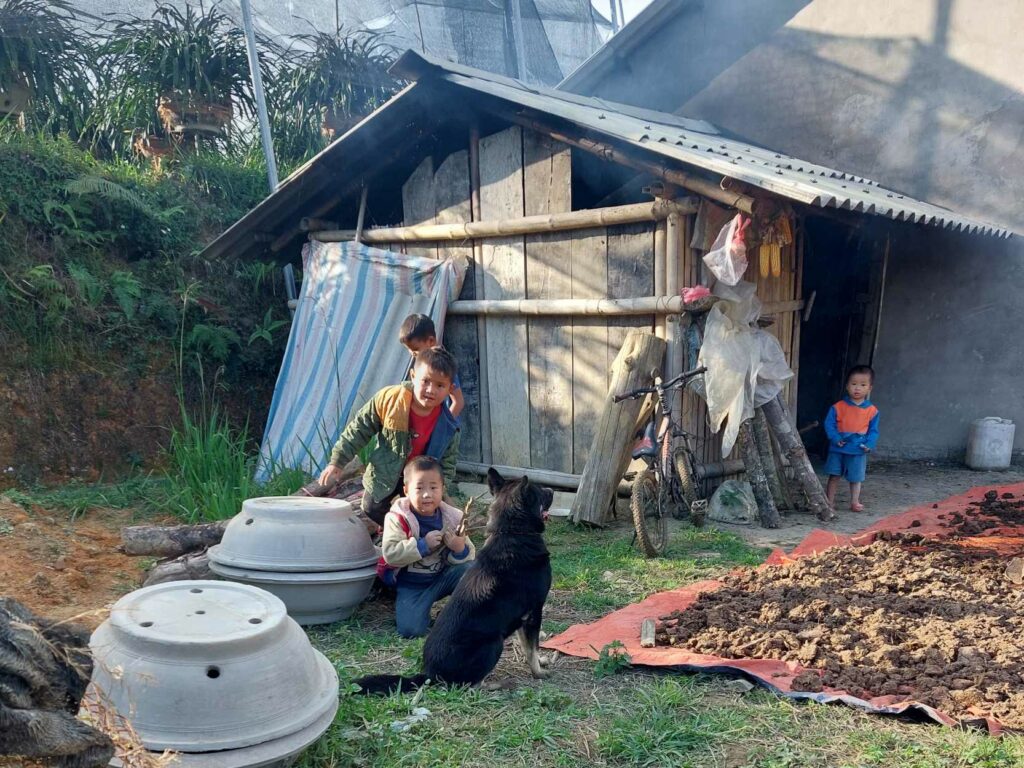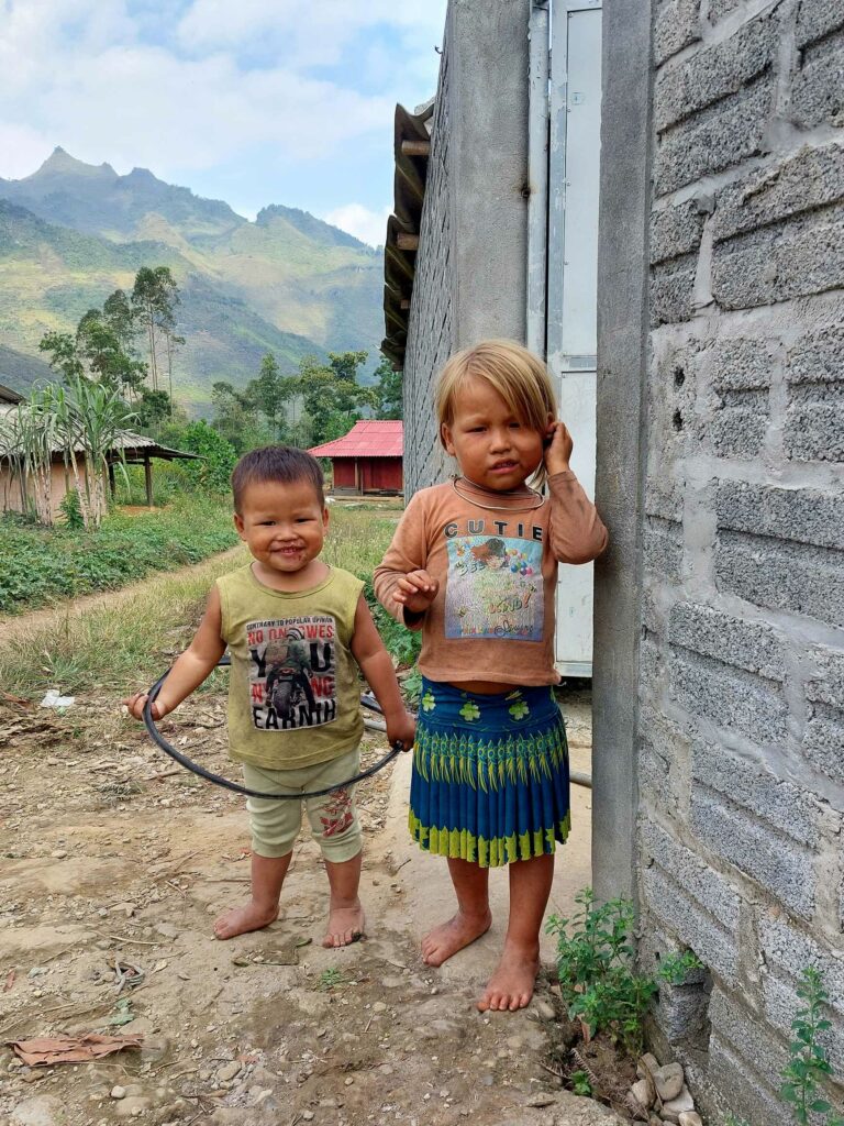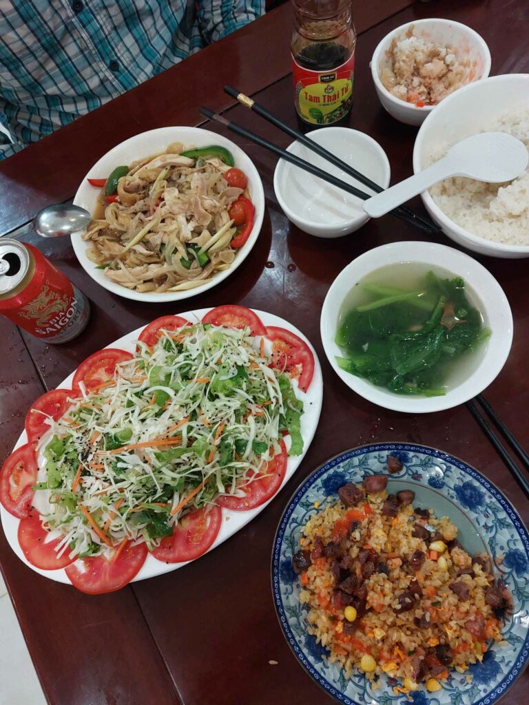 We fietsen Ha Giang stad uit en klimmen meteen naast een rivier de bergen in. We zien onderweg homestays leegstromen met brommers. Soms rijden toeristen zelf, vaak ook in groepen van bijvoorbeeld 15 lichte motoren met chauffeur/gids voorop. De vaak jonge toerist zit dan achterop met zijn mobiel de omgeving te filmen. Het is best een herrie als zo’n hele rij motoren ons voorbij rijdt. Met grote regelmaat zien we deze groepen. Soms ook zelf rijders, die de motor niet altijd onder controle heeft en de motor met de chauffeur wegrijdt. En iedereen weer toeteren. De omgeving is fabelachtig mooi. Telkens bergen, bergjes en heuveltjes die elkaar opvolgen, afgewisseld met rijstvelden. Wel of niet omringd door wolken. De eerste dag komen we in Nam Dam en logeren we in een, volgens oude bouwmethode met leem gemaakte, bungalow. We eten met de andere gasten, Chinezen en Duitsers en met de man, vrouw en kind des huizes hun plaatselijk pot: vlees, groenten, rijst, Fire of Happy water. Een sterke drank gemaakt van rijst. We eten natuurlijk met stokjes op kleine plastic stoeltjes aan een laag tafeltje. We eten gezamenlijk van de met gerechten gevulde schaaltjes. We zitten buiten bij een beetje licht van ledlampen. Ze hebben een leuze die ze roepen om te proosten met die wijn, voor het eten.