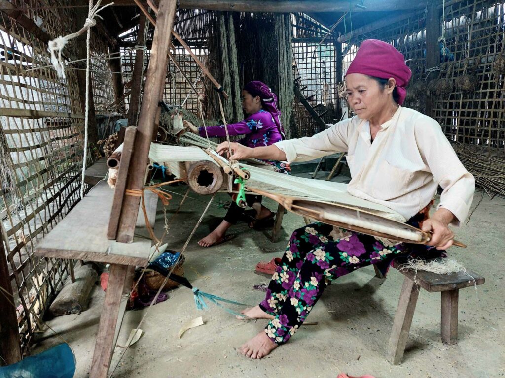 De tweede dag fietsen we naar Du Gia. We bezoeken een authentiek handicraft dorp waar men alles nog met de hand doet. Touw maken, spinnen, weven en stof beschilderen. Na een kruising zijn we veel van de brommers kwijt. Lekker rustig, maar dan blijkt dat wij een bergweggetje, 500 meter hoger, hebben genomen en de brommers onderlangs over een vlakke weg rijden. Toch ook niet echt de bedoeling. Maar de leuke oude huisjes en omgeving maakt veel goed. De kinderen onderweg zijn vriendelijk en leuk. Een heftige fietsdag. Uiteindelijk 1430 meter klimmen. Du Gia is een leuk en gezellig plaatsje. We blijven er een dag. ’s Avonds tijdens het eten ontmoeten we een aantal andere fietsers die de tegengestelde richting op gaan.