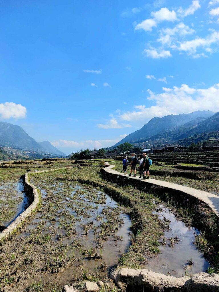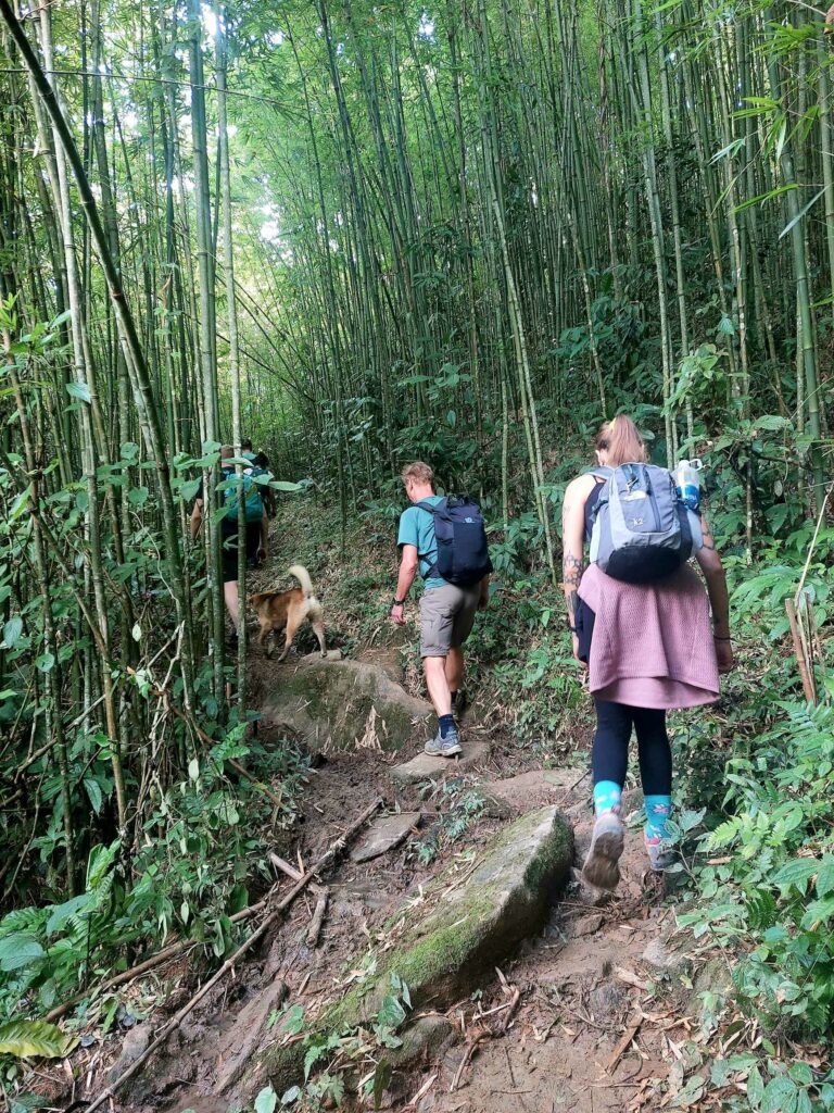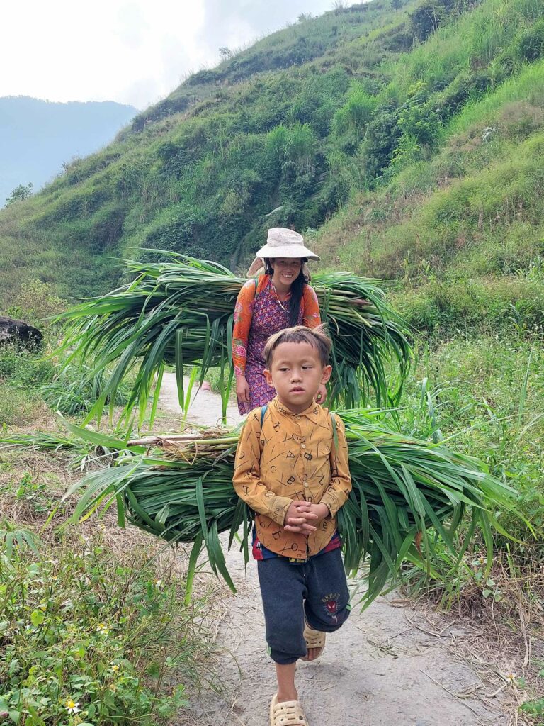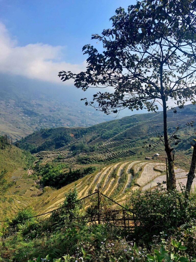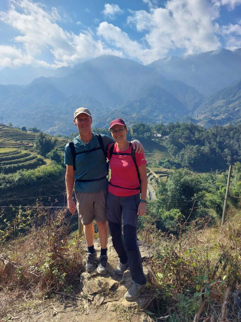 We boeken een tweedaagse trekking door de rijstvelden en door hilltribe dorpjes, dé attractie van de omgeving. We gaan met een gids en vier andere toeristen op pad. Al snel worden we vergezeld door locals die met ons mee lopen. Ze zeggen dat het is om Engels te leren en te praten met toeristen zodat ze later ook gids kunnen worden. Ook lopen er kinderen mee. Ze hoeven vandaag niet naar school omdat de leraar een studiedag heeft. Zo kunnen we van alles vragen. Ze helpen ons door lastige paadjes. Vrouwen zijn onderweg, al lopend, vlastouw aan het maken. We zien vooral in het begin ook andere toeristen. Het lijkt dan meer een optocht, maar later kiezen we ook vooral andere paadjes. Een mooie tocht dwars door de rijstvelden waarbij we een aantal kleine authentieke dorpjes bezoeken. We zien hier o.a. dat ze wierook maken met de kaneel die we eerder te drogen zagen liggen. De tweede dag lopen we door een bamboe bos en langs een waterval. Een mooi inkijkje in het (nog steeds zware) leven op het Vietnamese platteland. De lunch gebruiken we met een grote groep andere toeristen in een dorp onder in het vallei. Na 13 km komen we aan bij de Homestay waar we zullen slapen. ’s Avonds eten we met het gezin. Er wordt ook weer Happy water geschonken. De volgende dag lopen we nog 7 km waarna we na de lunch opgehaald worden door een busje.