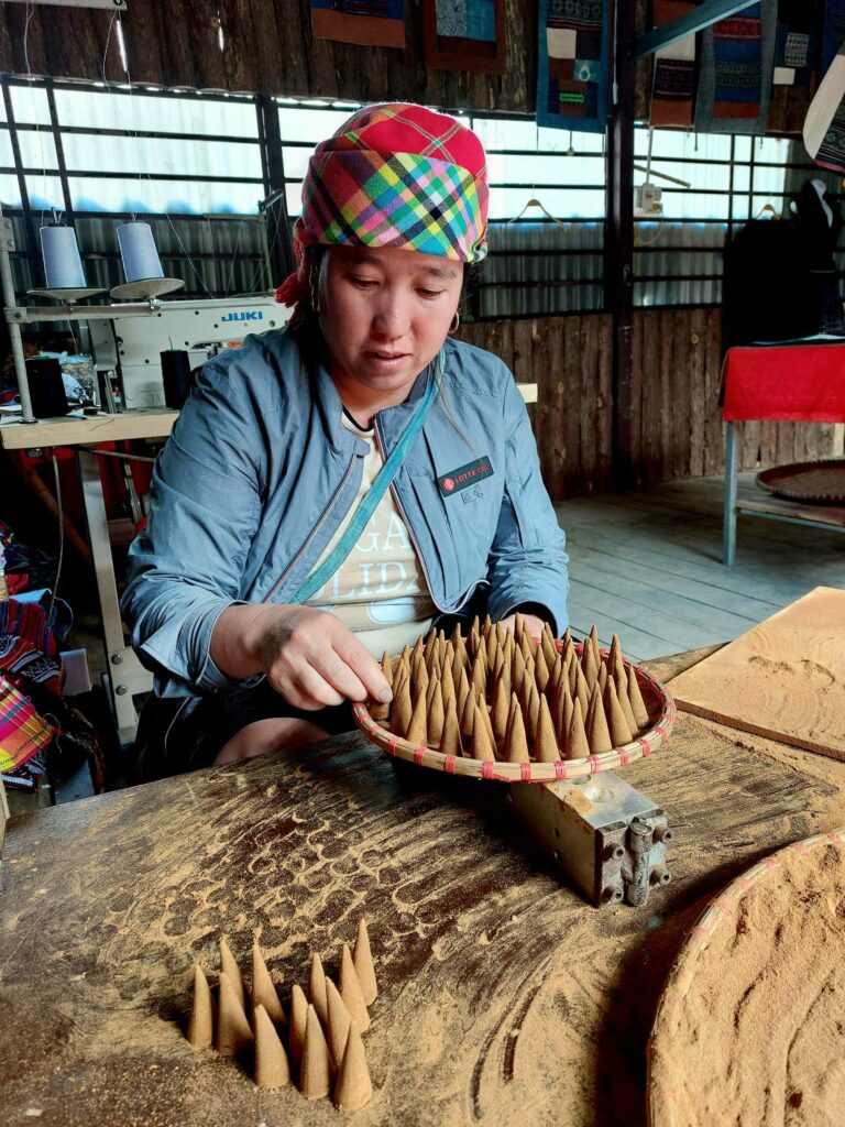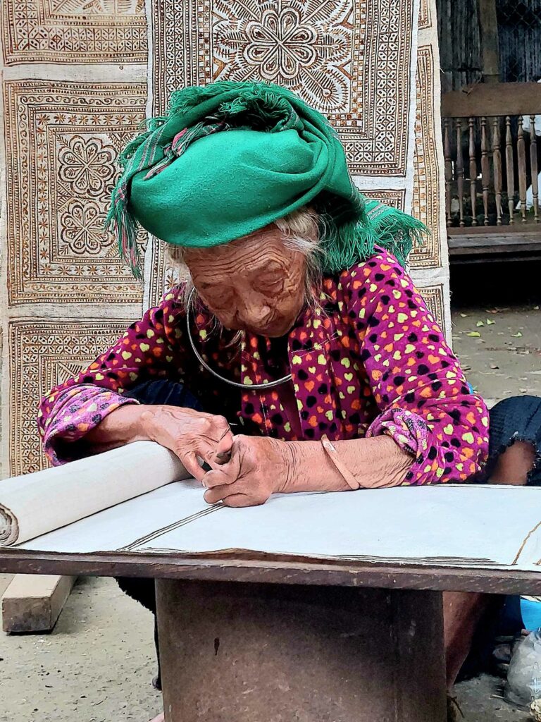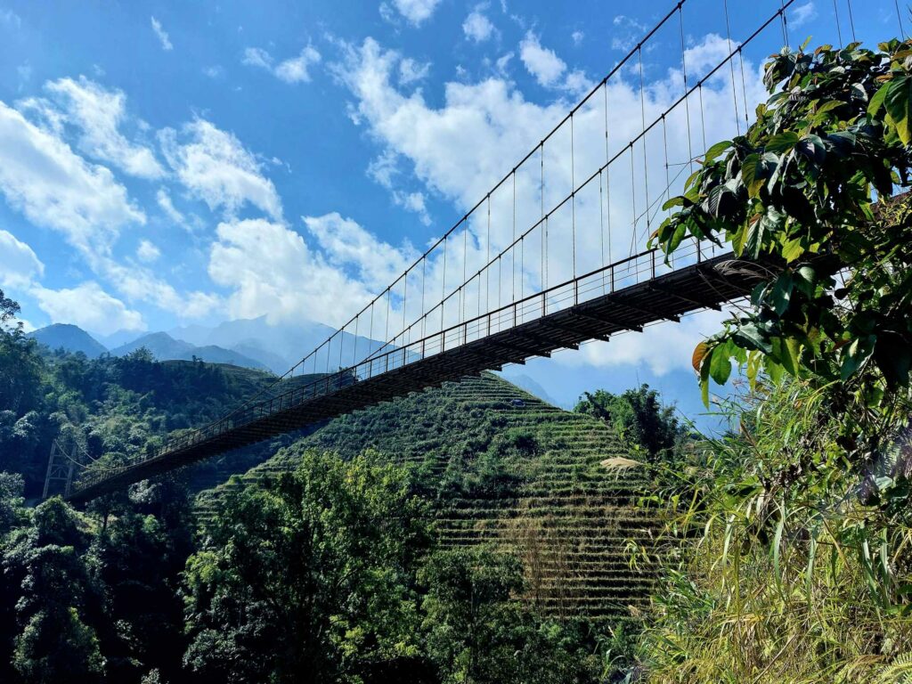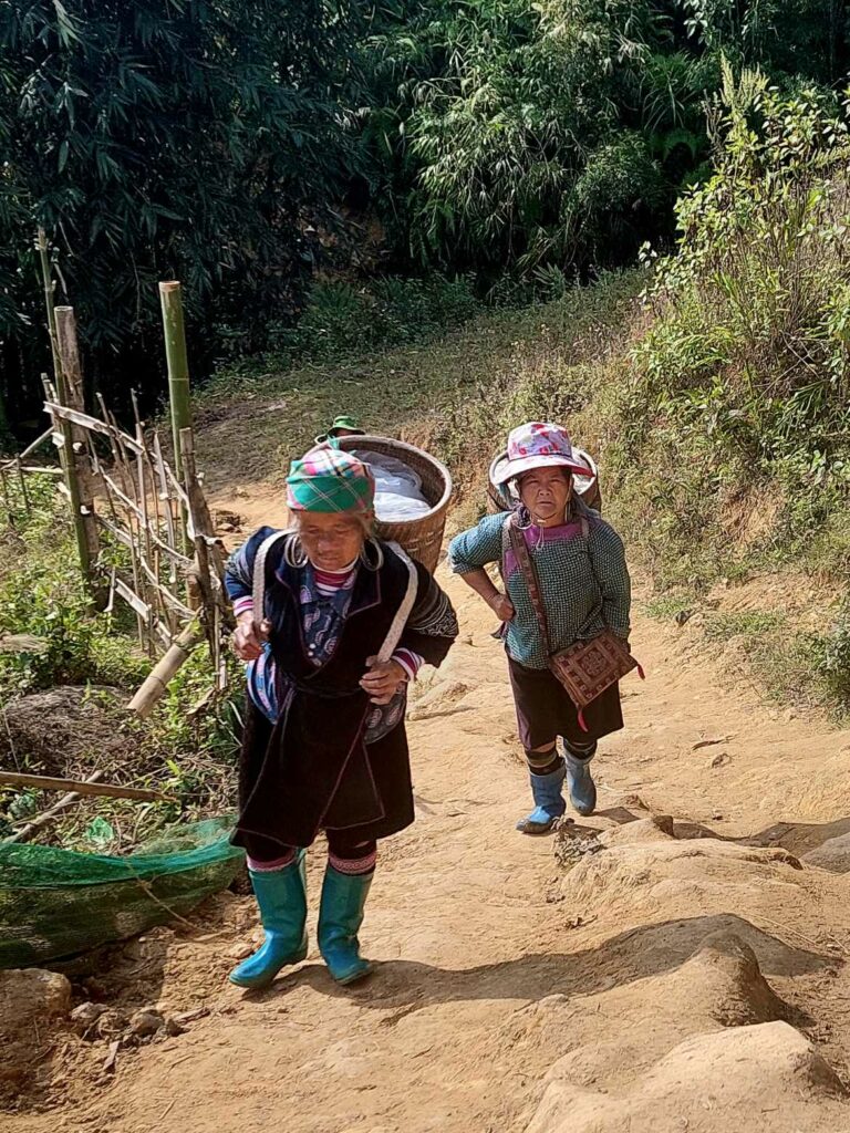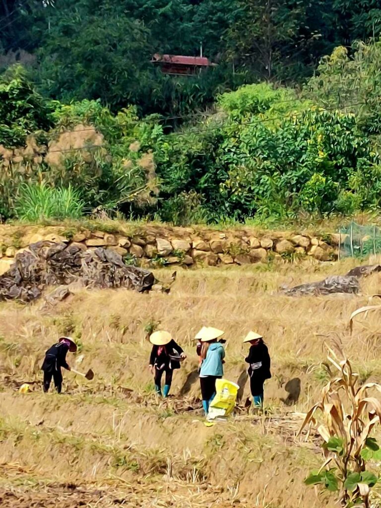 We boeken een tweedaagse trekking door de rijstvelden en door hilltribe dorpjes, dé attractie van de omgeving. We gaan met een gids en vier andere toeristen op pad. Al snel worden we vergezeld door locals die met ons mee lopen. Ze zeggen dat het is om Engels te leren en te praten met toeristen zodat ze later ook gids kunnen worden. Ook lopen er kinderen mee. Ze hoeven vandaag niet naar school omdat de leraar een studiedag heeft. Zo kunnen we van alles vragen. Ze helpen ons door lastige paadjes. Vrouwen zijn onderweg, al lopend, vlastouw aan het maken. We zien vooral in het begin ook andere toeristen. Het lijkt dan meer een optocht, maar later kiezen we ook vooral andere paadjes. Een mooie tocht dwars door de rijstvelden waarbij we een aantal kleine authentieke dorpjes bezoeken. We zien hier o.a. dat ze wierook maken met de kaneel die we eerder te drogen zagen liggen. De tweede dag lopen we door een bamboe bos en langs een waterval. Een mooi inkijkje in het (nog steeds zware) leven op het Vietnamese platteland. De lunch gebruiken we met een grote groep andere toeristen in een dorp onder in het vallei. Na 13 km komen we aan bij de Homestay waar we zullen slapen. ’s Avonds eten we met het gezin. Er wordt ook weer Happy water geschonken. De volgende dag lopen we nog 7 km waarna we na de lunch opgehaald worden door een busje.