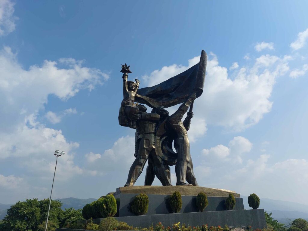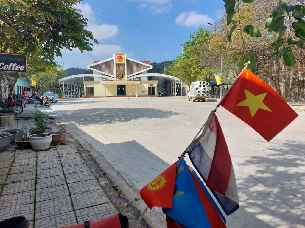 Het visum voor Laos hebben we bij de ambassade in Hanoi al geregeld. Na een week nemen we afscheid van Sa Pa en de mooie omgeving en vertrekken we richting de grens met Laos. Het blijft heel heuvelachtig. Flinke klimmen worden afgewisseld met nog grotere afdalingen. De rust heeft de heup van Vincent goed gedaan. Hij heeft er minder last van. Via social media hebben we contact gehouden met fietser Alex uit Frankrijk. We zijn hem tegen gekomen in Cappadocië, in Kirgizië en nu in Vietnam. We nemen hetzelfde hostel. Hij fietst nu met een Amerikaans stel waarvan de vrouw bijna blind is. De man stuurt haar via een geluidsverbinding in de helm. Ook heel apart. Na vier dagen fietsen komen we aan in Dien Bien Phu, de laatste stad voor de grens. We blijven er een dag en brengen een leuke avond door met Chloë en Charlely uit Frankrijk. Ze zijn net vanuit Laos gekomen en we wisselen tips uit over de komende route. De grens met Loas ligt natuurlijk boven op een berg. Duizend meter klimmen. Op 2/3 van de hoogte ligt een mijn met zand en grind. Daarom delen we tot dat moment de weg met veel vrachtwagens en nog meer stof. We waren gewaarschuwd voor de slechte weg. Daarom vinden we het eigenlijk nog wel meevallen. Zeker in vergelijking wat we in Centraal Azië al allemaal hebben gehad. De grensovergang is niet druk en we zijn al snel op wel in niemandsland naar de grensovergang met Laos.