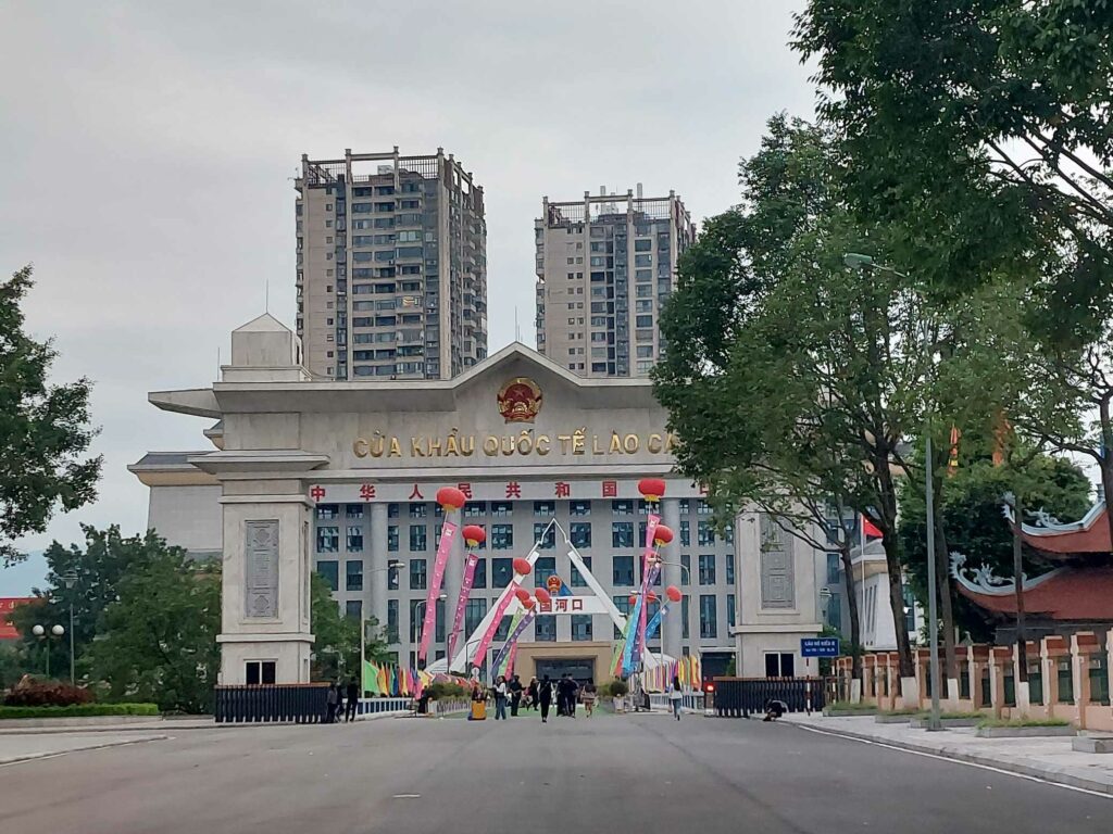 Na een extra dag verlaten we Ha Giang en fietsen in vier dagen naar Sa Pa. Net voor Lao Cai bereiken we het punt waar we 7500 km hebben gefietst deze reis. Lao Cai ligt bij de Chinese grens. We lopen naar de grenspost en zien China aan de andere kant van dichtbij liggen. Het is er een drukte van belang met allerlei verkopers die inkopen hebben gedaan in China en met heel grote koffers vol spullen terugkomen. Vanaf hier is het nog maar 30 km naar Sapa, maar wel 1500 m klimmen. Vincent heeft al een paar dagen last van zijn heup. Om niets te forceren proberen we een lift te nemen. Er komen al meteen Vietnamezen vragen of we hulp nodig hebben. Wij proberen de lege vrachtwagentjes of busjes aan te houden. Soms stopt er iemand, maar die heeft dan zijn achterbak toch vol. Na een uurtje stopt een vrachtwagen die ons wel meeneemt. De fietsen achter in de bak, vast gebonden aan de zijkant. De tassen los achterin. Het is mistig onderweg. Soms zijn de wolken even weg. Net voor Sa Pa moet de chauffeur stoppen omdat hij een andere kant op moet. We bedanken hem hartelijk, van een vergoeding wil hij niets weten. Als we aankomen in Sapa is het erg mistig. We zien amper de overkant van de straat.