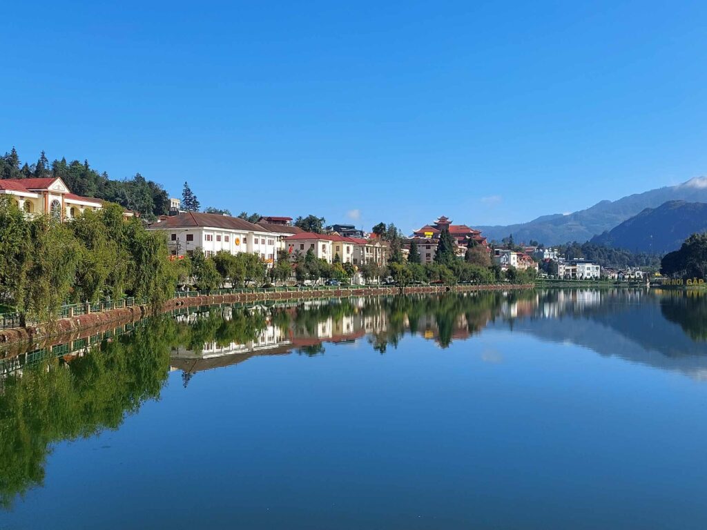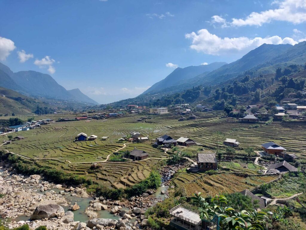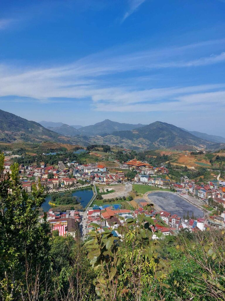 Na een koffiepauze in de mist op een bankje bij het meer, zoeken we ons hostel op wat we deze keer via Booking hebben gereserveerd; Himalaya Hostel. Net om de hoek bij het meer. Prima plek. Het blijft de hele dag mistig. We lopen een keer rond langs de winkels en restaurants. Twee dagen later, als de mist is opgetrokken, zien we pas waar we echt gelopen hebben. We lopen een berg op naar een uitzicht punt. Er zijn allerlei trappen gemaakt en we moeten er ook voor betalen. Maar het uitzicht op Sa Pa en het meer is heel mooi. Hier komen we ook weer andere toeristen tegen. Er zijn leuke restaurantjes waar we een keer iets anders kunnen eten dan rijst groenten en vlees. Een andere dag maken we een wandeling naar een naburig dorpje, Ta Phin. We komen echter midden tussen de rijstvelden uit waar ook water in staat. Over de smalle paadjes zoeken we de weg. Weer een andere dag huren we een motorscooter voor 150.000 dong (6 euro) en verkennen zo de omgeving.